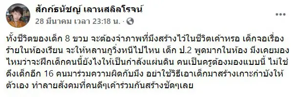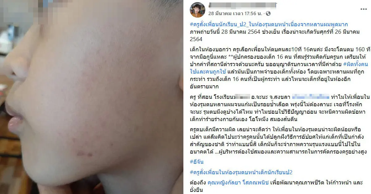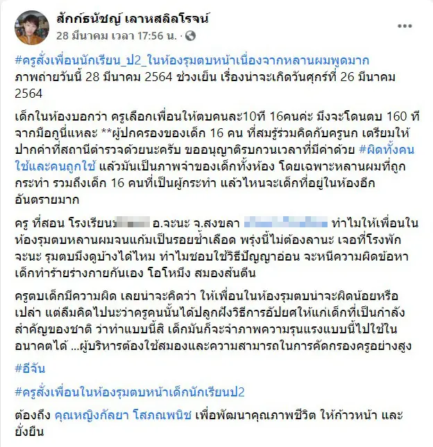 จากกรณีที่ผู้ใช้เฟสบุ๊ค สักก์ธนัชญ์ เลาหสลิลโรจน์ ได้ออกมาโพสต์ภาพและข้อความระบุว่า หลานของตนที่เป็นนักเรียนชั้น ป.2 ของโรงเรียนแห่งหนึ่งใน จ.สงขลา ถูกครูสั่งให้เพื่อนทั้งห้องรุมตบเนื่องจากหลานตนพูดมาก โดยครูให้เพื่อน 16 คน ตบหน้าหลานตนคนละ 10 ที รวมแล้วถูกตบ 160 ที จนหน้าช้ำเส้นเลือดฟอยที่หน้าแตก