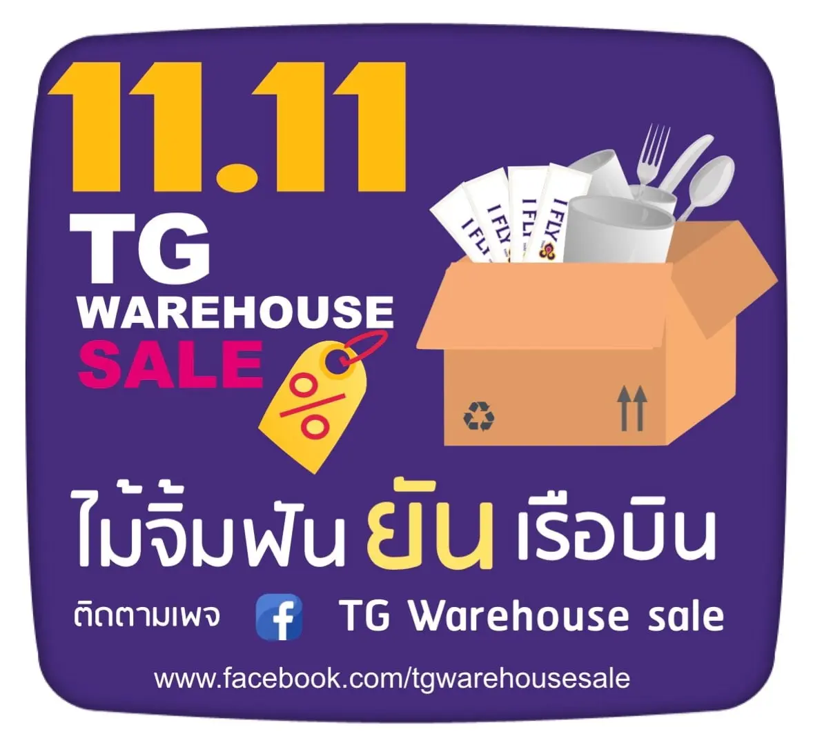 11 พ.ย. 63 ฝ่ายบริหาร บริษัท การบินไทย จำกัด (มหาชน) ได้ถือฤกษ์ 11.11 หรือทางการตลาดเรียกว่า “วันคนโสด” จัดโครงการที่ชื่อว่า “ทีจี แวร์เฮาส์ เซล” (TG Warehouse Sale) เพื่อเพิ่มประสิทธิภาพการใช้พัสดุที่ให้บริการในเที่ยวบิน อาทิ จาน ชาม ของใช้ต่างๆ ให้มีความเหมาะสมกับจำนวนเที่ยวบินที่จะคาดว่าจะลดลงอย่างมาก ในช่วง 1-2 ปีจากนี้ หลังหยุดให้บริการผู้โดยสารเนื่องจากวิกฤตโควิด-19 กว่า 6 เดือนที่ผ่าน