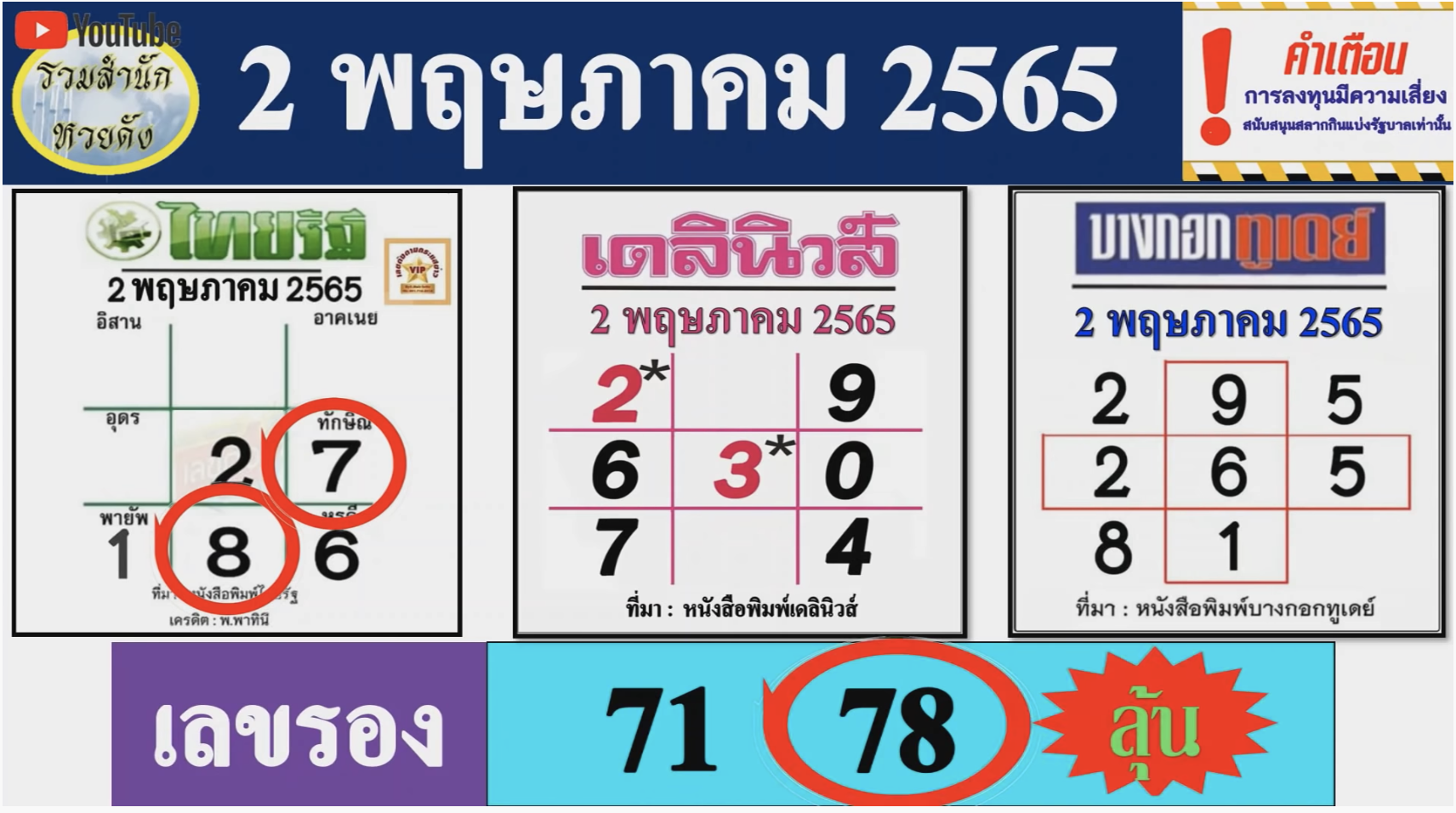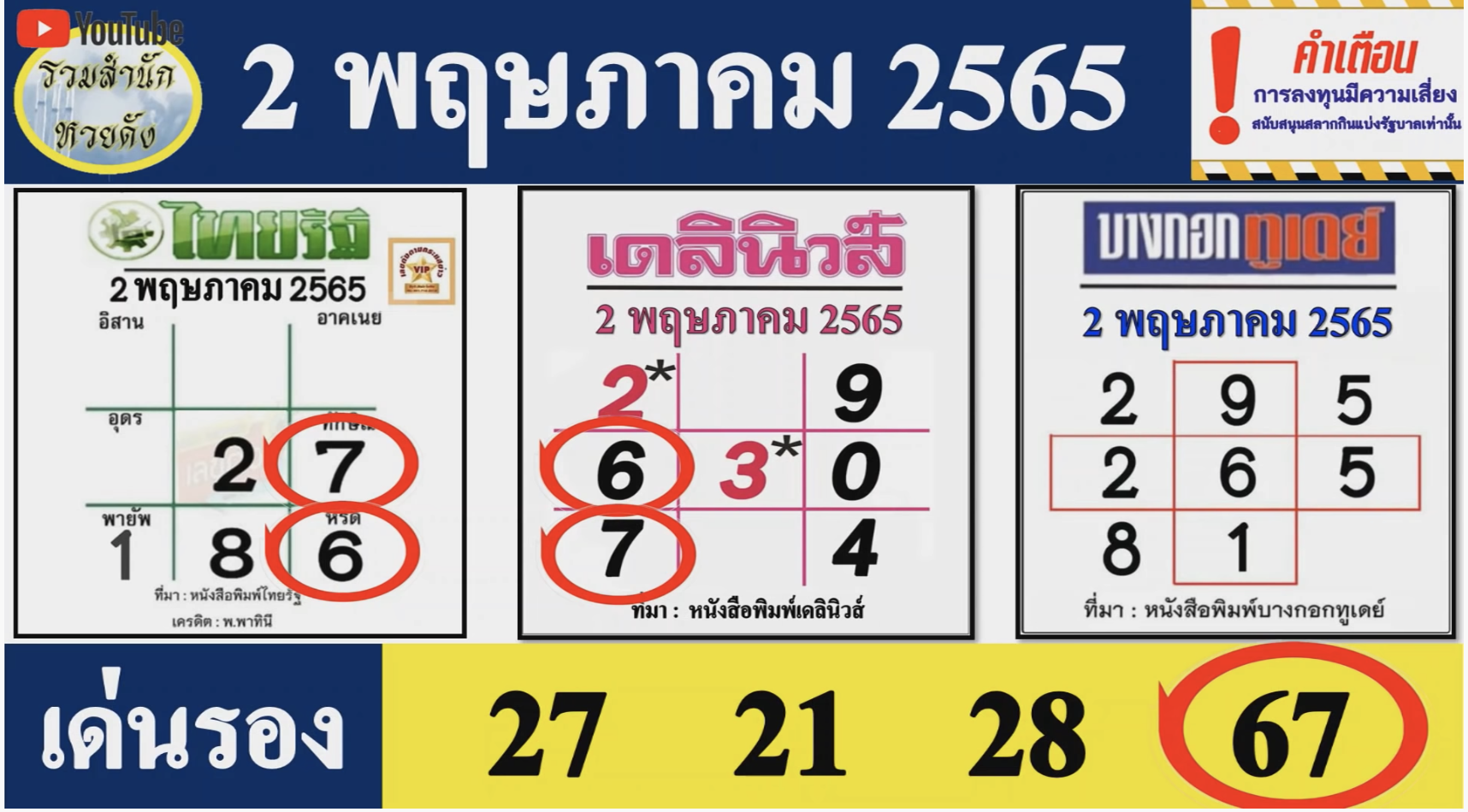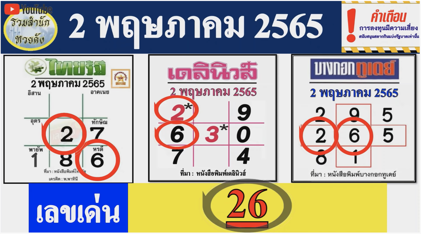 และล่าสุดปล่อยมาเลขเด็ดมาสบทบอีกหนึ่งสำนักดัง อย่างเลขเด็ดจากหนังสือพิมพ์ ไทยรัฐ ซึ่งก่อนหน้านี้ปล่อยเลขเด็ดของ เดลินิวส์ บางกอกทูเดย์ เป็นที่เรียบร้อย เจอเลขชนกันถึง 3 ตัว นั้นก็คือ 2-6-9 แต่หากเราดูจากทั้งสามสำนักดังแล้วนั้น เลขที่ปล่อยชนกัน นั้นกก็คือ 2 และ 6 หวังว่าจะสามารถเป็นกนวทางเลือดซื้อสลากกินแบ่งรัฐบาลงวดวันที่ 2 พฤษภาคม 2565 ได้ไม่มากน้อย ขอให้ทุกคนโชคดี