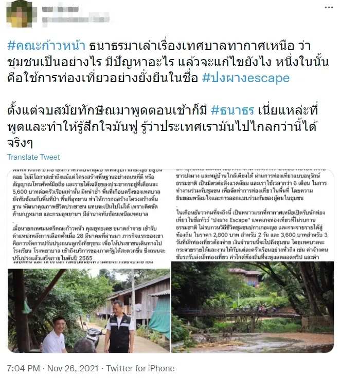 ไม่เว้นแม้แต่ ธนาธร จึงรุ่งเรืองกิจ ประธานคณะก้าวหน้า ก็ได้นำคอนเทนต์ละครคุณธรรมมาสร้างเป็นละครสั้นโปรโมทสถานที่ท่องเที่ยว ปงผาง Escape แพ็กเกจท่องเที่ยวชุมชนแบบโลว์คาร์บอน เป็นมิตรต่อสิ่งแวดล้อม