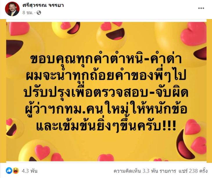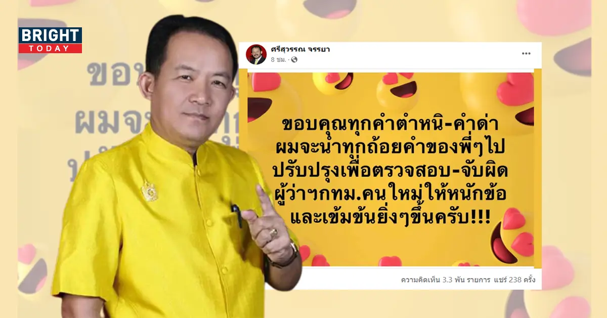 ศรีสุวรรณ โพสต์ข้อความผ่านเฟซบุ๊ก ขอบคุณทุกคำตำหนิ เผย นำทุกถ้อยคำไปปรับปรุง และจับผิด ผู้ว่าฯคนใหม่ เข้มข้นขึ้น
