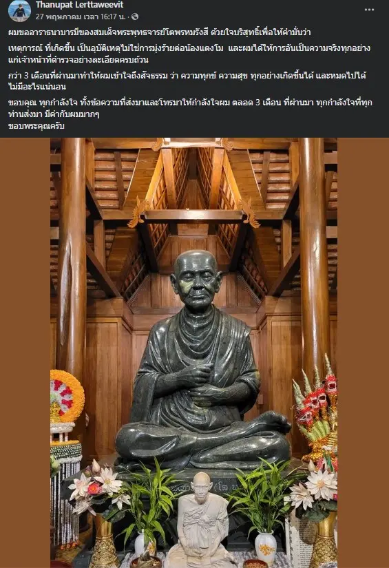 ผมขออาราธนาบารมีของสมเด็จพระพุทธจารย์โตพรหมรังสี ด้วยใจบริสุทธิ์เพื่อให้คำมั่นว่าเหตุการณ์ ที่เกิดขึ้น เป็นอุบัติเหตุไม่ใช่การมุ่งร้ายต่อน้องแตงโม และผมได้ให้การอันเป็นความจริงทุกอย่างแก่เจ้าหน้าที่ตำรวจอย่างละเอียดครบถ้วนกว่า 3 เดือนที่ผ่านมาทำให้ผมเข้าใจถึงสัจธรรม ว่า ความทุกข์ ความสุข ทุกอย่างเกิดขึ้นได้ และหมดไปได้ ไม่มีอะไรแน่นอนขอบคุณ ทุกกำลังใจ ทั้งข้อความที่ส่งมาและโทรมาให้กำลังใจผม ตลอด 3 เดือน ที่ผ่านมา ทุกกำลังใจที่ทุกท่านส่งมา มีค่ากับผมมากๆ ขอบพระคุณครับ