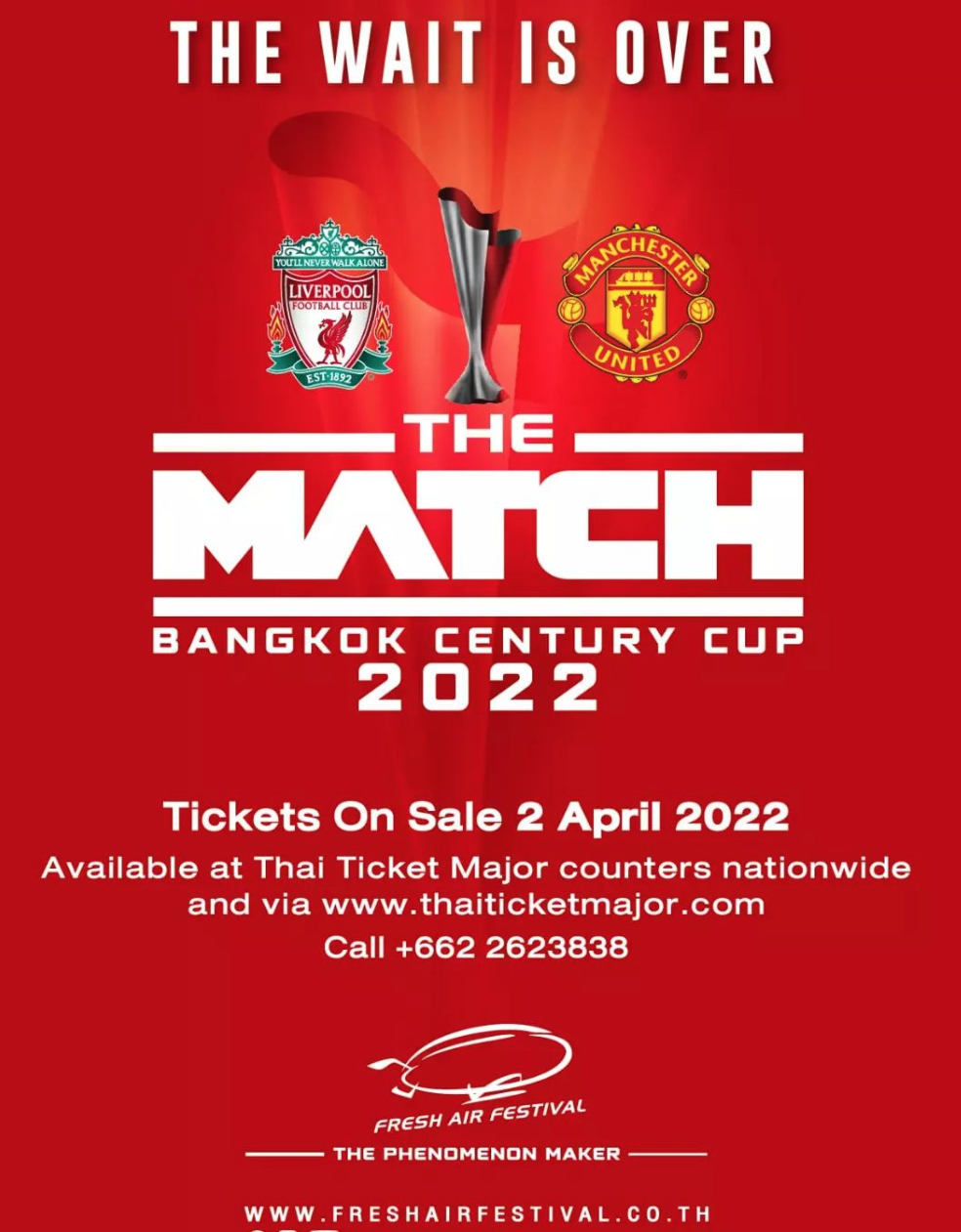 เตรียมเปิดฉากฟาดแข้งกันแล้ว สำหรับศึกฟุตบอลนัดประวัติศาสตร์รายการ 𝐓𝐇𝐄 𝐌𝐀𝐓𝐂𝐇 𝐁𝐚𝐧𝐠𝐤𝐨𝐤 𝐂𝐞𝐧𝐭𝐮𝐫𝐲 𝐂𝐮𝐩 𝟐𝟎𝟐𝟐 ในวันที่ 12 กรกฎาคม 2565 ที่สนามราชมังคลากีฬาสถาน ในเวลา 20.00 น. โดยเป็นเกมส์ แดงเดือด ระหว่าง ลิเวอร์พูล พบ แมนยู สองยอดทีมดังจากพรีเมียร์ลีก อังกฤษ ที่จะบินข้ามน้ำข้ามทะเล มาโชว์ฝีเท้าตัวเป็นๆ ให้แฟนบอลไทย ได้ชมกันติดขอบสนามประเทศไทย