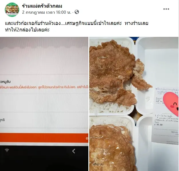 ทางร้านจึงได้ เพิ่มข้าวไข่เจียวให้อีก 1 กล่อง พร้อมกับเขียนข้อความลงบนใบเสร็จว่า “อีกกล่องทางร้านฝากให้เด็กค่ะ ทานให้อิ่มนะคะ” โดยทางร้านได้นำเรื่องราวดังกล่าวมาเผยแพร่พร้อมระบุข้อความว่า “และแล้วก็เจอกับร้านตัวเอง….เศรษฐกิจแบบนี้เข้าใจเลยค่ะ ทางร้านเลยทำให้ 2 กล่องไปเลยค่ะ”
