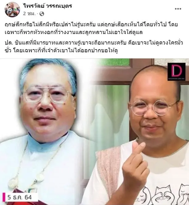 ล่าสุด 5 ธ.ค. 64 ทิดไพรวัลย์ โพสต์เฟซบุ๊กส่วนตัว “ไพรวัลย์ วรรณบุตร” ระบุว่า ฤกษ์สึกหรือไม่สึกมีหรือเปล่าไม่รู้นะครับ แต่ฤกษ์เสือกเห็นได้โดยทั่วไป โดยเฉพาะก็พวกหัวหงอกที่ว่างงานและลูกหลานไม่เอาใจใส่ดูแล