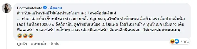 …. ทำตาสองชั้น เก็บหนังตา ทำจมูก ยกคิ้ว ปลูกผม ดูดไขมัน ทำซิกแพค ฉีดผิวออร่า ฉีดปากเติมฟิลเลอร์ โบท็อก10000 u ฉีดวิตามิน ดูดไขมันเหนียง เมโสแฟต ร้อยไหม หน้าV ทุบโหนก เติมคาง เติมฟิลเลอร์ปาก เลเซอร์ปากสีชมพู อาจจะต้องมีเลเซอร์กำจัดขนอีกนิดหน่อย…ไม่เยอะค่ะ #หมดเมนู