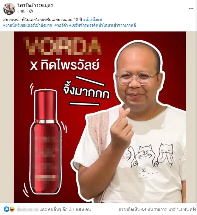 เรื่องราวล่าสุดของ ทิดไพรวัลย์ หลังจากที่เข้าวงการ อินฟลูเอนเซอร์ คือการที่เขาได้พรีวิวสินค้าเซรั่มของแบรนด์หนึ่ง ก่อนจะเริ่มใช้งานจริง โดยเขาได้ระบุว่า “สภาพหน้า ที่ไม่เคยโดนเลยมาตลอด 18 ปี”