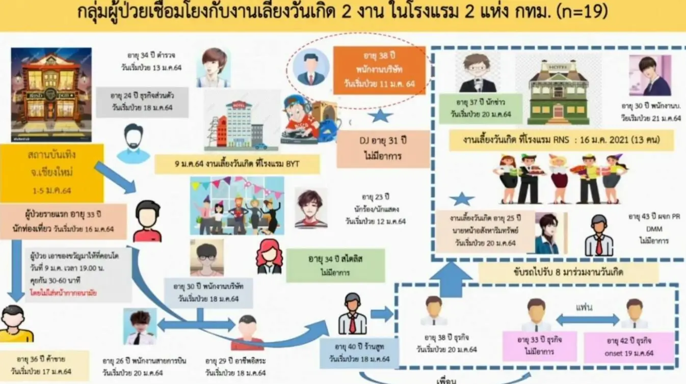 - 22 ม.ค. มาทำงานตามปกติ โดยเข้าตรวจโควิดช่วง09.00น. ที่ รพ. ตำรวจ จากนั้นเข้าประชุมห้อง 302 เวลา 11.00 น. ช่วงเย็นเดินทางกลับที่พัก เวลาประมาณ 18.00 น. ได้รับแจ้งยืนยันพบโควิด 19 จึงกลับมารายงานตัวที่โรงพยาบาลตำรวจ และได้เข้ากักกันโรคที่โรงพยาบาล