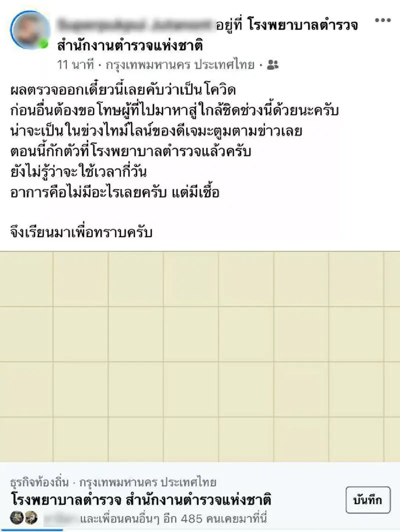 จากกรณี ลูกนายพลคนดัง ซึ่งเป็นตำรวจตำแหน่ง สารวัตร ติดเชื้อ โควิด-19 อาจเชื่อมโยงกลุ่มของ ดีเจมะตูม ที่ติดเชื้อไปก่อนหน้านี้ เบื้องต้นตำรวจคนดังกล่าวเข้ารักษาอาการที่โรงพยาบาลตำรวจแล้ว