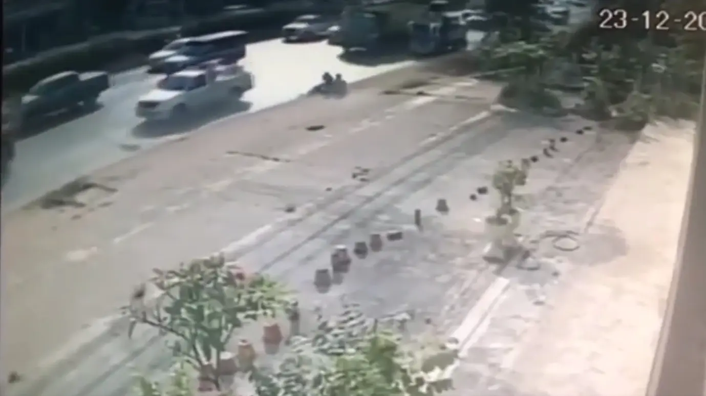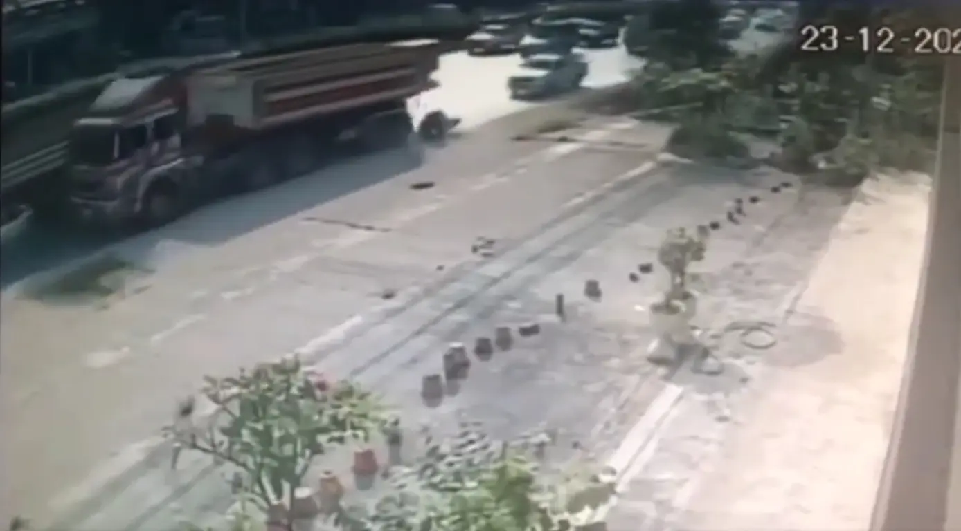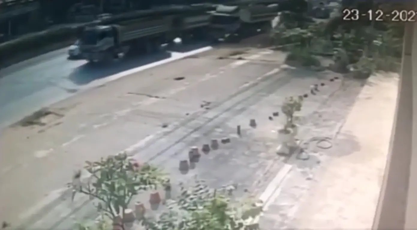 โดยคลิปจากกล้องวงจรจับภาพบนถนนสายหนึ่ง ซึ่งเป็นช่วงเหตุการณ์ขณะรถบรรทุกคันหนึ่งกำลังจะวิ่งแซงซ้ายรถบรรทุกอีกคันในเลนซ้ายสุด จะเห็นได้ว่ามีรถมอเตอร์ไซค์โดนรถบรรทุกคันดังกล่าวเบียดจนล้มลง ซึ่งรถบรรทุกอาจจะไม่รู้ว่ามีการเบียดหรือชนเกิดขึ้น จึงไม่ได้หยุดรถและมุ่งหน้าขับต่อไป