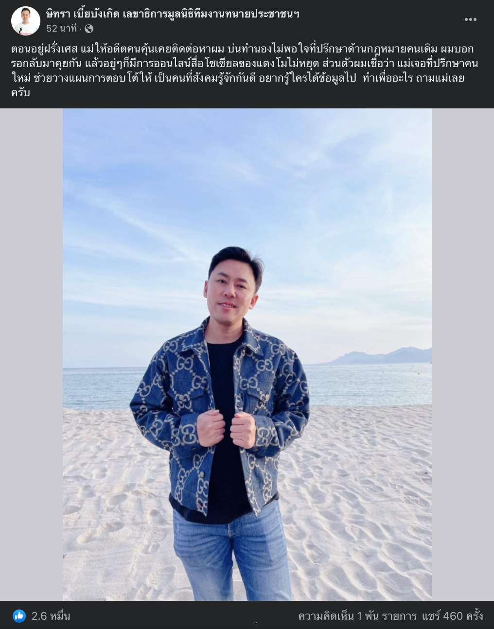 ตอนอยู่ฝรั่งเศส แม่ให้อดีตคนคุ้นเคยติดต่อหาผม บ่นทำนองไม่พอใจที่ปรึกษาด้านกฎหมายคนเดิม ผมบอกรอกลับมาคุยกัน แล้วอยู่ๆก็มีการออนไลน์สื่อโซเชียลของแตงโมไม่หยุด ส่วนตัวผมเชื่อว่า แม่เจอที่ปรึกษาคนใหม่ ช่วยวางแผนการตอบโต้ให้ เป็นคนที่สังคมรู้จักกันดี อยากรู้ใครได้ข้อมูลไป ทำเพื่ออะไร ถามแม่เลยครับ