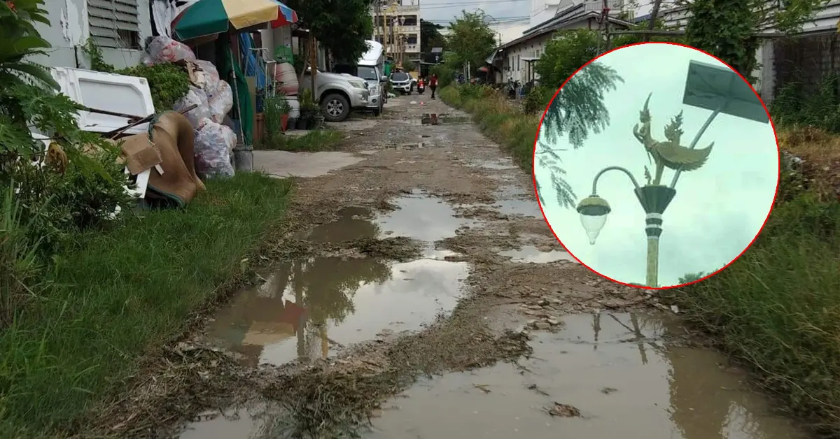 เพจดัง แฉภาพ ถนนภายในซอยกิ่งแก้ว 25/1 (ซอยพลูเกษ) จ.สมุทรปราการ ติดตั้ง เสาไฟกินรี ต้นละแสนสวยงาม แต่สภาพถนนด้านล่างดูไม่ได้! – ล่าสุดปปช.เข้าตรวจสอบแล้ว