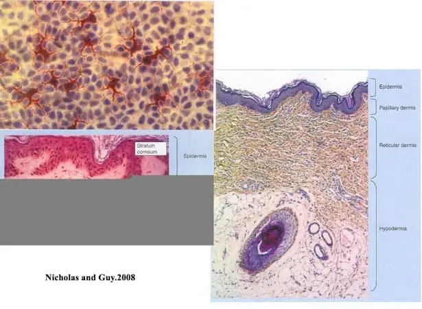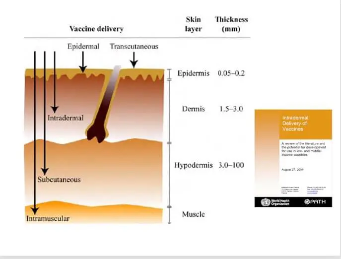 รูปแสดง การบริหารการฉีดวัคซีนเข้าชั้นผิวหนังและใช้ในการฉีดวัคซีนโรคพิษสุนัขบ้าและวัคซีนไข้หวัดใหญ่ของบริษัทต่างประเทศที่ใช้อยู่ปัจจุบันนี้ก็เป็นการฉีดเข้าชั้นผิวหนัง