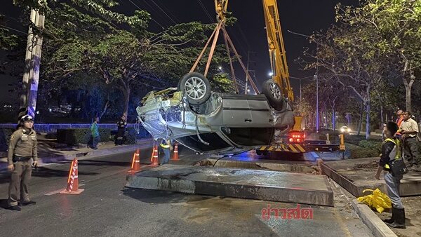 ระทึก! หนุ่มใหญ่ขับ วอลโว่ ซื้อของไหว้เจ้า วันตรุษจีน ก่อนแซงฝ่าแนวกั้นซ่อมถนน ตกหลุมท่อประปา ลึก 6 เมตร ถนนสรงประภา เขตดอนเมือง