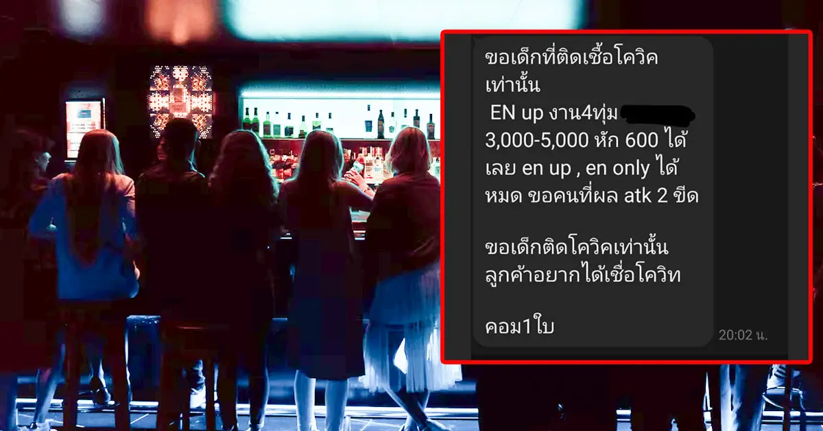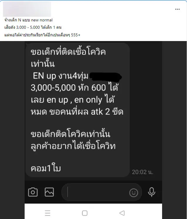 แต่ต้องสะดุดเพราะคุณสมบัติอีกข้อที่นายจ้างต้องการคือ ขอเด็กที่ติดเชื้อโควิดเท่านั้น และต้องมีผลตรวจ ATK รับเสียด้วย และย้ำท้ายอีกกว่า “ขอเด็กที่ติดเชื้อโควิดเท่านั้น เพราะลูกค้าอยากได้เชื้อโควิด”