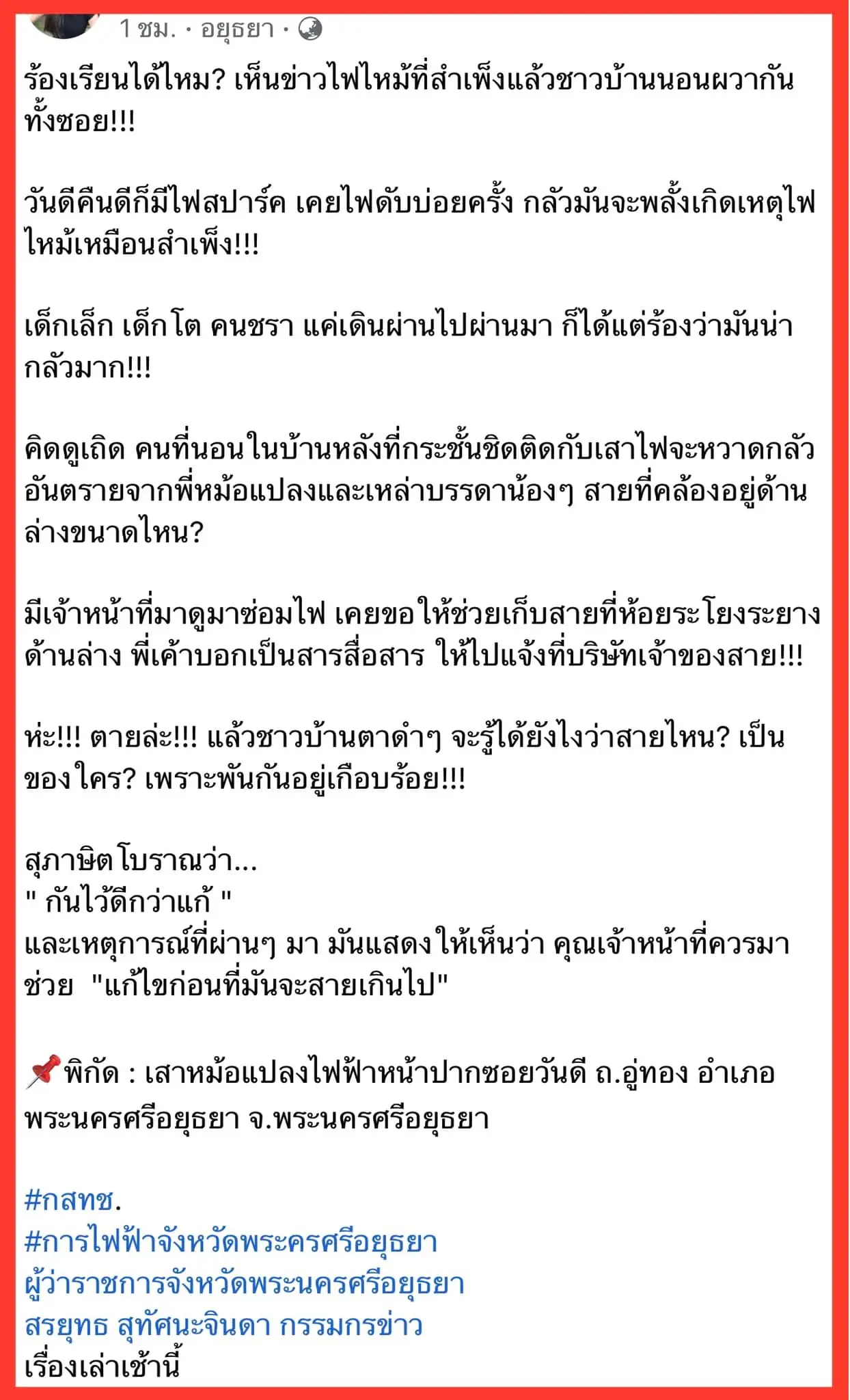 ชาวพระนครศรีอยุธยา ออกมาร้องเรียนกรณี ปัญหาสายไฟห้อยระโยงระยาง โดยเพจ สรยุทธ สุทัศนะจินดา กรรมกรข่าว ได้ออกมารายงานว่า