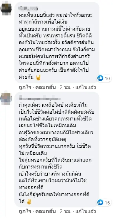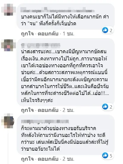 ในขณะที่ชาวเน็ตต่างได้เข้ามาแสดงความรู้สึกหดหู่ใจเนื่องจากคาดว่าถ้าแฟนเพจรายนี้ไม่ได้รับความเดือดร้อนจริงคงไม่คิดที่ขายไตเช่นนี้ พร้อมทั้งยังได้ร่วมกันให้กำลังใจผู้ใช้งานรายนี้อีกด้วย