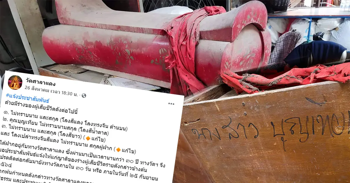 “วัดศาลาแดง” โพสต์ประกาศ ตามหาญาติ หลังฝากร่างผู้เสียชีวิตในโลงกับทางวัด นานกว่า 30 ปี และระบุโปรดติดต่อกลับทางวัดภายใน 30 วัน