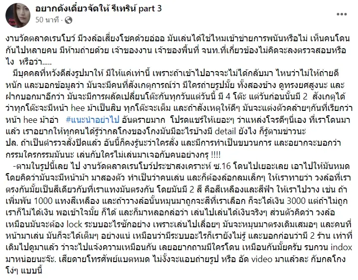 นอกจากนี้ทางเพจยังได้ระบุข้อความอีกว่า ด้านหน้าซุ้มจะมีคนคอยสังเกตการณ์ว่ามีใครแอบถ่ายรูปหรือไม่ทั้งสองข้าง และภายในซุ้ม วงล้อเสี่ยงโชคจะมีอยู่ 4 โต๊ะ ทุกโต๊ะจะมีหน้าม้าหลายสิบคนหากสังเกตการแต่งกายจะพบว่ามีลักษณะที่คล้ายกัน พร้อมกับแนะนำว่าถ้าเจอกลุ่มคนในลักษณะนี้อย่าเดินเข้ขาไปเล่นเนื่องจากอันตราย อาจเป็นกลุ่มก้อนของมิจฉาชีพ