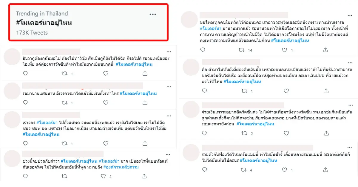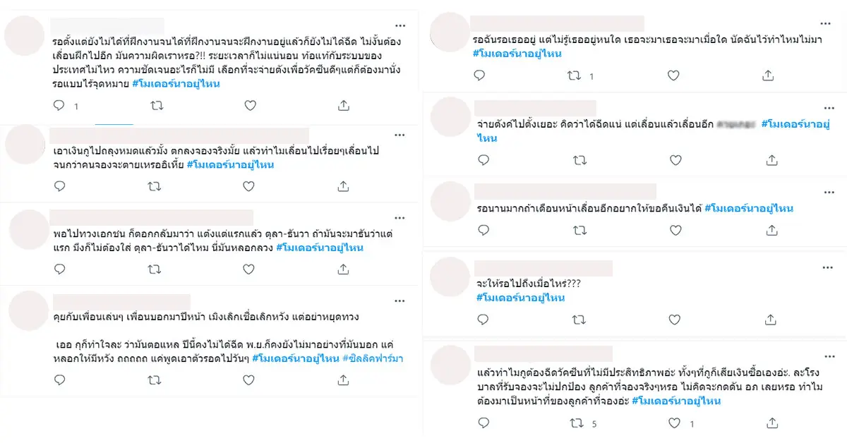 ทั้งนี้จากประเด็นการเลื่อนคิวฉีดวัคซีน กลายเป็นที่พูดถึงในโลกออนไลน์ ชาวเน็ตที่มีความคิดเห็นในเรื่องนี้ ต่างติด #โมเดอร์นาอยู่ไหน ทะยานขึ้นเทรนทวิตเตอร์ไทย โดยเสียงส่วนมากพูดถึงความแน่ชัดของการจัดส่งวัคซีน เพราะประเด็นดังกล่าวถูกพูดถึง และเลื่อนมาหลายครั้งแล้ว บางส่วนถามถึงประเด็นการคืนเงินที่จ่ายไปก่อนหน้านี้ หากไม่มีความแน่ชัด