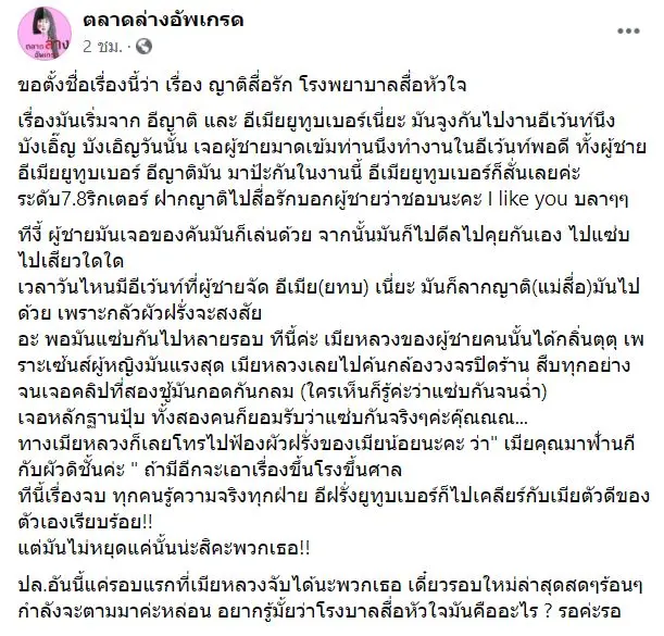 ล่าสุด 23 มิ.ย. 64 เพจเฟซบุ๊ก ตลาดล่างอัพเกรด ได้โพสต์ข้อความใหม่ล่าสุดสดๆร้อนๆ ว่า ขอตั้งชื่อเรื่องนี้ว่า เรื่อง ญาติสื่อรัก โรงพยาบาลสื่อหัวใจ