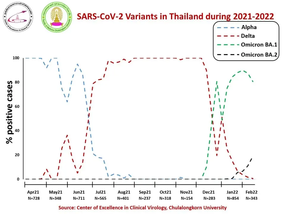 จากการศึกษาของศูนย์เชี่ยวชาญเฉพาะทางด้านไวรัสวิทยาคลินิก คณะแพทย์ศาสตร์จุฬาฯ ในการติดตามสายพันธุ์โอมิครอน ที่พบในเขตกรุงเทพมหานคร จะเห็นว่าสายพันธุ์ที่พบทั้งหมด เป็นสายพันธุ์ โอมิครอน ส่วนใหญ่ที่พบยังเป็นสายพันธุ์ย่อย BA.1 ในเดือนกุมภาพันธ์นี้มีแนวโน้มที่พบ สายพันธุ์ BA.2 เพิ่มขึ้นมาโดยตลอด (จากรูป) สายพันธุ์ BA.2 ไม่ได้มีความรุนแรงเพิ่มขึ้น แต่จะติดต่อง่ายขึ้นกว่าสายพันธุ์ BA.1 และจะเป็นเหตุ ให้การแพร่กระจายของโรคได้มากขึ้น