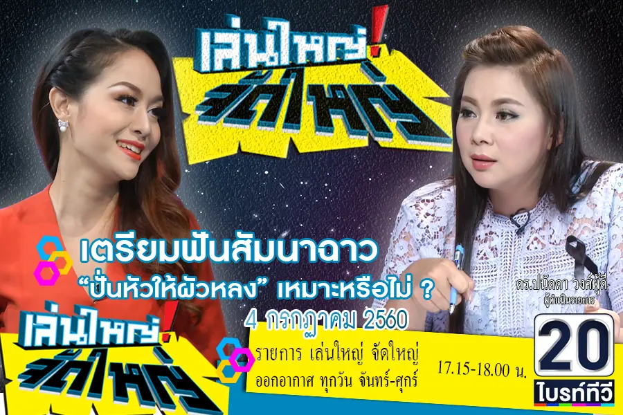 วันนี้พบกับครูกิ๊บ นลิสา สีตบุตร เปิดคอร์สที่มีชื่อว่า “ปั่นหัวให้ผัวหลง” ซึ่งเป็นคอร์สที่ช่วยผู้หญิงที่ผัวนอกใจ ผัวมีกิ๊กให้กลับมารักมาหลงได้เหมือนเดิม ติดตามได้ในรายการเล่นใหญ่! จัดใหญ่!