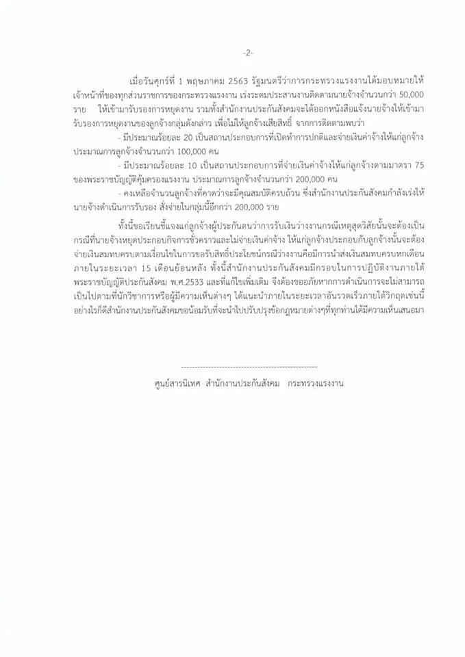 ทั้งนี้ สำนักงานประกันสังคมคาดว่าจะมีจำนวนผู้มาขอรับสิทธิประโยชน์กรณีว่างงานราวๆ 1.2 ล้านคน คิดเป็นเงินจำนวน 20,000 – 30,000 ล้านบาท