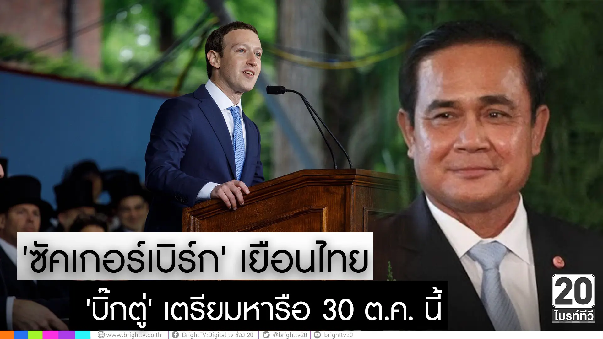 นายสมคิด จาตุศรีพิทักษ์ รองนายกรัฐมนตรี เปิดเผยว่า นายมาร์ค ซัคเกอร์เบิร์ก ประธานเจ้าหน้าที่บริหาร และประธานเจ้าหน้าที่ฝ่ายปฏิบัติการ ผู้ก่อตั้ง FACEBOOK สื่อสังคมออนไลน์อันดับ 1 ของโลก จะเดินทางมาเยือนประเทศไทยปลายเดือนตุลาคมนี้ และในวันที่ 30 ตุลาคม จะเข้าพบหารือกับ พล.อ.ประยุทธ์ จันทร์โอชา นายกรัฐมนตรีด้วย ซึ่งการพบครั้งนี้จะเป็นภาพลักษณ์ที่ดีต่อประเทศไทย เพราะ FACEBOOK เป็นดาต้าเซ็นเตอร์และมีการเชื่อมโยงไปทั่วโลก สะท้อนถึงความสนใจของ FACEBOOK ที่มีต่อประเทศไทย และจะได้หารือถึงทิศทางการขยายตัวของ FACEBOOK ในภูมิภาคอาเซียนด้วย