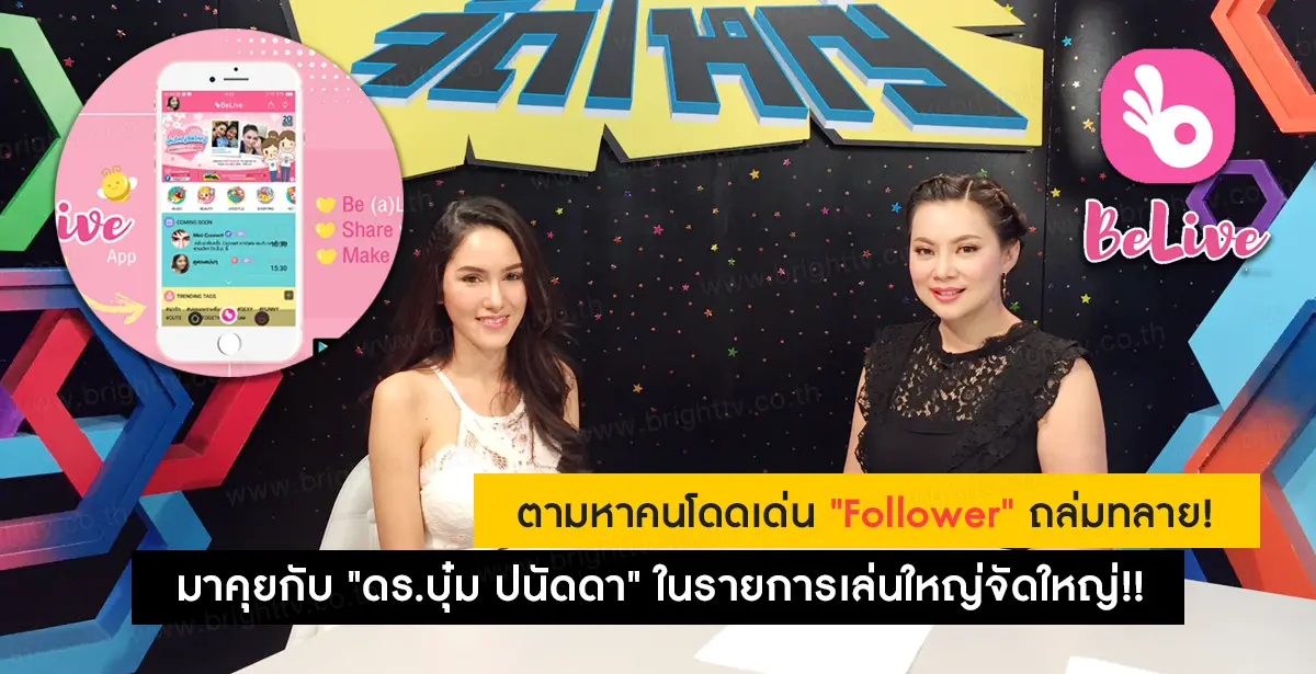 และสำหรับใครที่โหลดแอพพลิเคชั่น “Belive” แล้วมียอด Follower ถล่มทลายโดดเด่นไม่เหมือนใคร มีสิทธิ์มาร่วมเป็นแขกรับเชิญกระทบไหล่ “ดร.บุ๋ม ปนัดดา วงศ์ผู้ดี” ในรายการ เล่นใหญ่จัดใหญ่ ทางไบรท์ทีวีช่อง 20