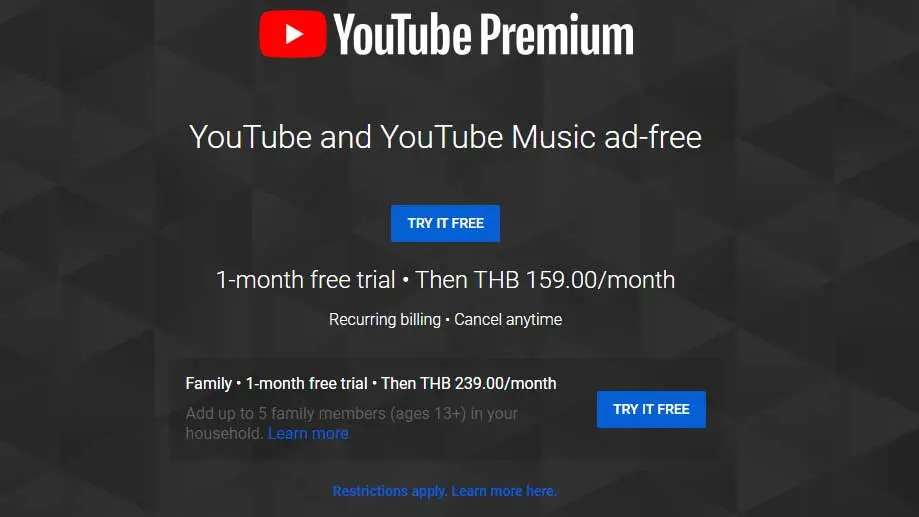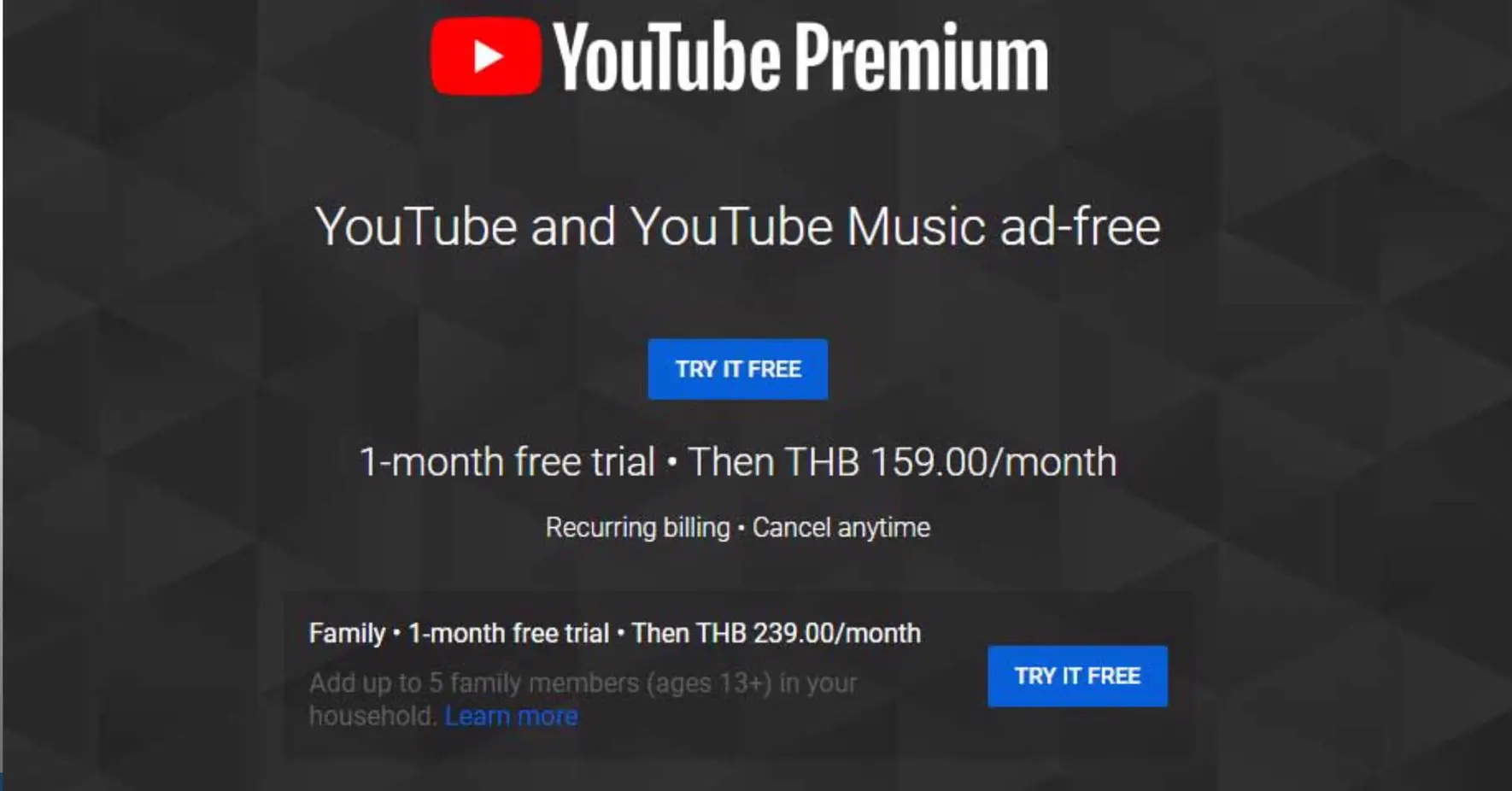 สำหรับ YouTube Premium ราคาเปิดตัวแพ็กเกจที่ไทย อยู่ที่เดือนละ 159 บาท เปิดให้บริการพร้อมสิงคโปร์และมาเลเซีย และสำหรับคนเพื่อนเยอะ สามารถซื้อแพ็กเกจ Family ราคา 239 บาท เพื่อหาคนมาหาร ตกเฉลี่ยเดือนละ 47.8 บาท สามารถใช้ได้มากถึง 5 บัญชี ซึ่งคุ้มมากๆ